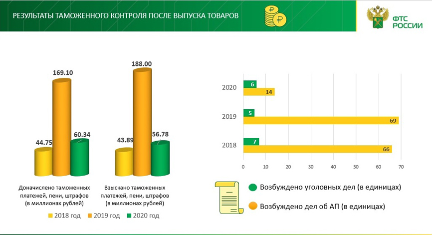 Начальник отдела контроля после выпуска товаров Пермской таможни Алексей Кравченко отмечает: «Новеллой 2020 года стало взаимодействие отдела таможенного контроля после выпуска товаров с территориальными управлениями Налоговых служб, отделением таможенной статистики таможни при организации контроля за товарами, классифицируемыми в товарной позициях 27 группы Товарной номенклатуры внешнеэкономической деятельности Евразийского экономического союза и Единого таможенного тарифа Евразийского экономического союза, в рамках распоряжения Приволжского таможенного управления от 22.10.2020 № 28-р «Об утверждении временного порядка по организации контроля за соблюдением соглашений». По данному направлению возбуждено 2 дела об административных правонарушениях по части 1 статьи 16.2 КоАП России, предполагаемый штраф 323,20 тыс. руб.».