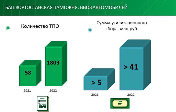 За 11 месяцев текущего года Башкортостанская таможня оформила 1803 ТПО (таможенный приходной ордер) на уплату утилизационного сбора в отношении ввезенных из за рубежа автомобилей, что в 31 раз больше, чем в прошлом году (в 2021 г. – 58). Общая сумма утилизационного сбора составила 41 441 751,97 руб., из них 122 225,04 руб. − пени (в 2021 г. − 5 286 883,64 руб. и 962 083,64 руб. соответственно).