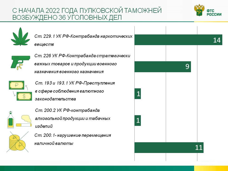 По фактам контрабанды стратегически важных товаров (ст. 226.1 УК РФ) таможенники возбудили еще 10 уголовных дел (8 по ввозу ювелирных изделий и 2 – по вывозу). Стоимость незаконно перемещенных драгоценных украшений составила почти 104 млн рублей. Показатель в 2 раза превысил данные прошлого года.