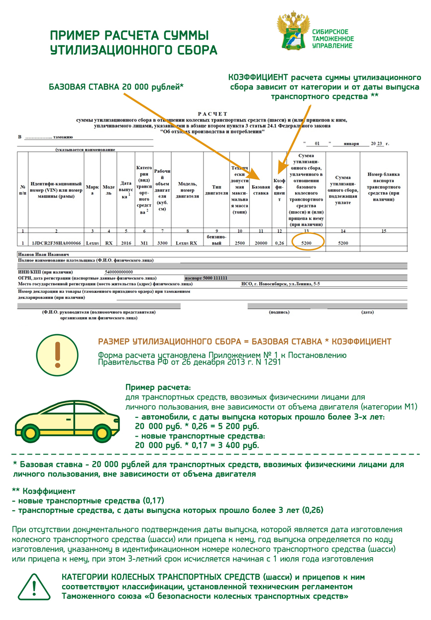 - пример для самостоятельного расчета физическим лицом размера утилизационного сбора;