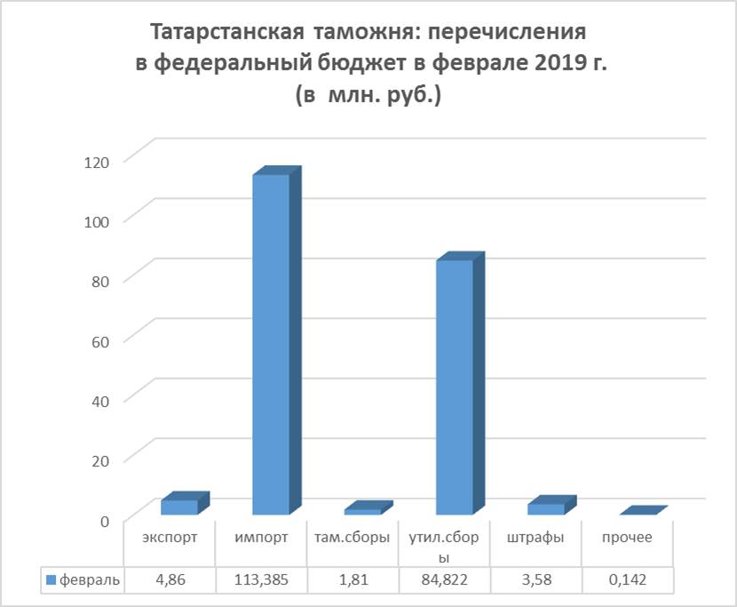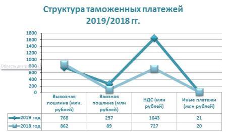 Из общей суммы перечисленных таможенных платежей таможенная пошлина по импорту составила 17,5 млн. рублей, по экспорту – 55 млн. рублей, налог на добавленную стоимость составил 1 млрд. 52 млн. рублей, акцизный сбор – 7,9 млн. рублей.