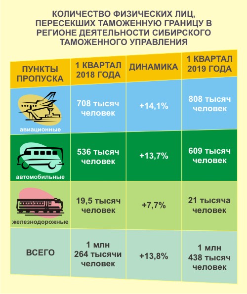 Около 609 тысяч физических лиц проследовали через автомобильные пункты пропуска Сибирского региона, в аналогичном периоде 2018 года – около 536 тысяч. Через железнодорожные пункты пропуска таможенную границу в нашем регионе пересекли около 21 тысячи человек, в 1 квартале 2018 года – около 19,5 тысяч.