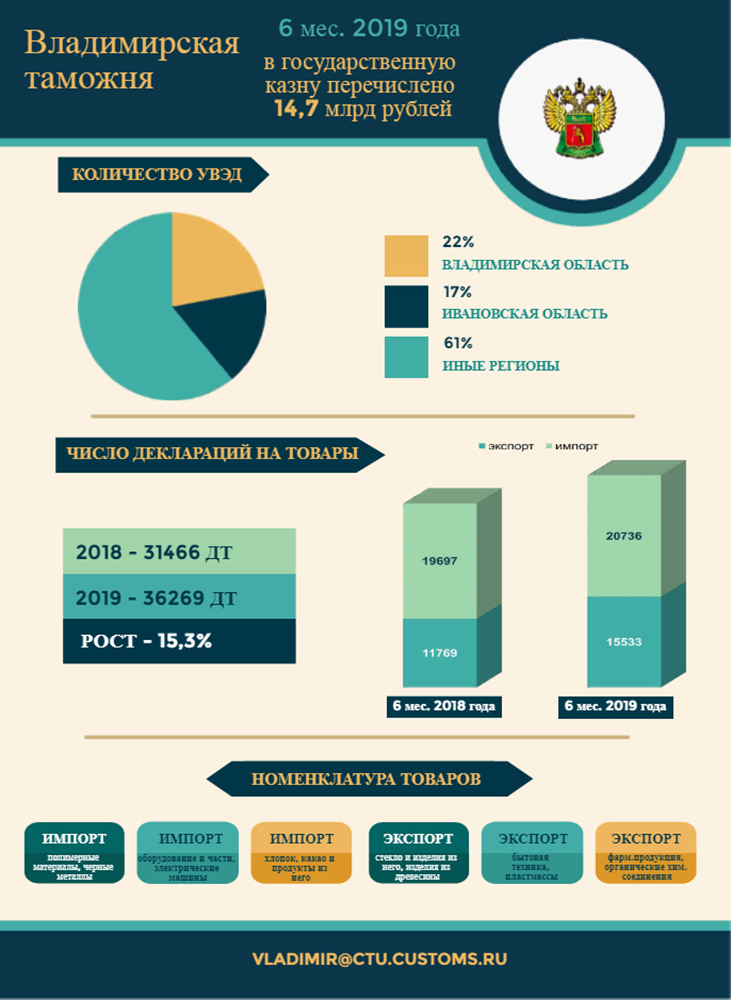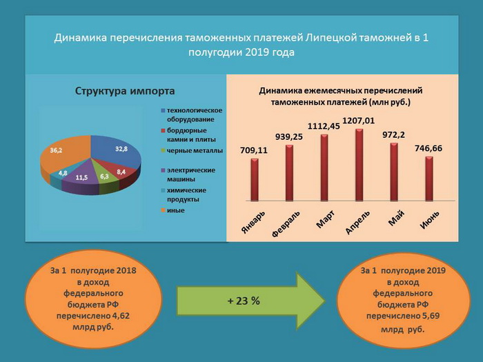 За 1 полугодие 2019 года в государственную казну Иркутской таможней было перечислено более 9 млрд 167 млн рублей, что на 3 млрд 452 млн рублей превышает объем перечислений первого полугодия 2018 года.
