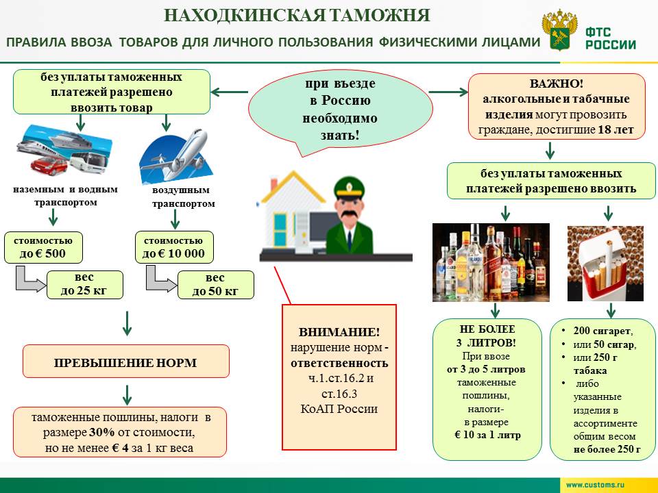 Решением Совета Евразийской экономической комиссии ограничения по перемещению достигшим 18-летнего возраста лицом этилового спирта, алкогольных напитков и пива (общим объемом не более 5 литров), а также табака и табачных изделий (в количестве не более 200 сигарет, или 50 сигар (сигарилл), или 250 г табака, или общим весом не более 250 г) будут распространяться только на ввоз такой продукции.