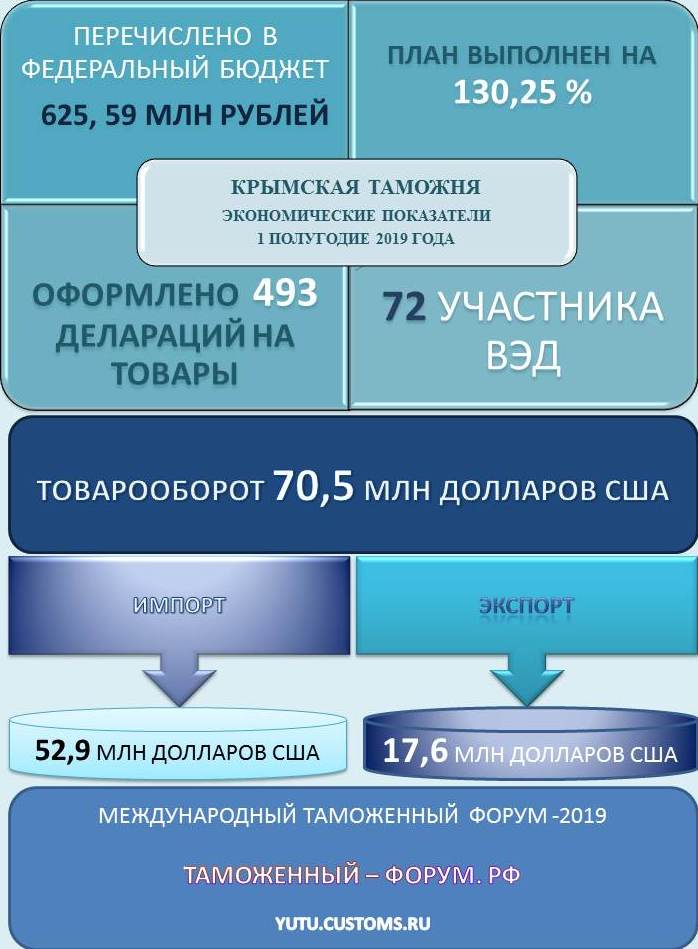 В первом полугодии 2019 года Крымской таможней в федеральный бюджет перечислено 625,59 млн рублей таможенных платежей, что в 1,3 раза превышает уровень предыдущего года. Исполнение контрольного задания составило 130,25% .