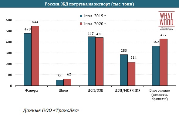 Растут и экспортные ж/д перевозки фанеры, шпона и биотоплива в 1 пол. 2020 г.: фанера на 14% г/г до 544 тыс. тонн, шпон на 15% г/г до 62 тыс. тонн, биотопливо (пеллеты, брикеты) на 18% г/г до 427 тыс. тонн. Поставки ДВП/MDF/HDF снизились на 25% г/г до 214 тыс. тонн; перевозки ДСП/OSB остались примерно на уровне 2019 г.