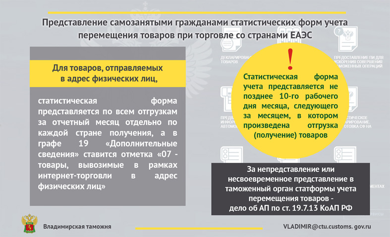 В личном кабинете участника ВЭД на сайте ФТС России для самозанятых граждан реализована возможность представления в таможенные органы статистических форм учета перемещения товаров при торговле со странами ЕАЭС в соответствии с постановлением Правительства Российской Федерации от 19 июня 2020 г. № 891.